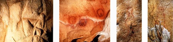 Abbildungen von Menschen sind äußerst selten in den Steinzeithöhlen. Bei den wenigen vorhandenen stehen die Geschlechtsteile im Mittelpunkt (untere Bildreihe). Auch hier finden wir inszenatorische Tendenzen. So sind die beiden Männerumrisse rechts mit "Penissen" aus den Stalagmiten der Tropfsteinhöhle gebildet, wo sie gewissermaßen eine Erektionsbewegung imitieren.