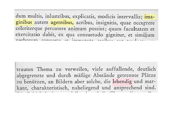 Der zentrale Abschnitt der memoria-Kapitel in den klassischen Handbüchern der Gedächtniskunst beschäftigt sich mit der Frage, welche Art von Bildern man sich am besten wählt. Die Antwort lautet, wie dem Cicero-Zitat zu entnehmen ist: imagines agentes. Damit sind Bilder gemeint, die so markant sind, dass sie gut im Gedächtnis bleiben – besonders schöne oder besonders hässliche Gesichter etwa – weil sie im Inneren des Meorierenden "etwas in Bewegung bringen" (Rhetorica Ad Herennium III, 22, 37).