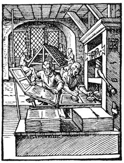 Der Holzschnitt von Jost Amman zeigt zudem, wie der Stempel mit Stoffballen auf das Papier gedrückt wird, damit die Tinte gut haftet.