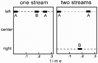 Dient dem Nachweis, dass die zeitliche Einschätzung auditiver Informationen exakter ist, wenn diese aus einem homogenen "stream" (hier: einem der beiden Stereokanäle) statt aus räumlich verteilten Quellen (beiden Kanälen) kommen.