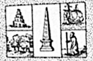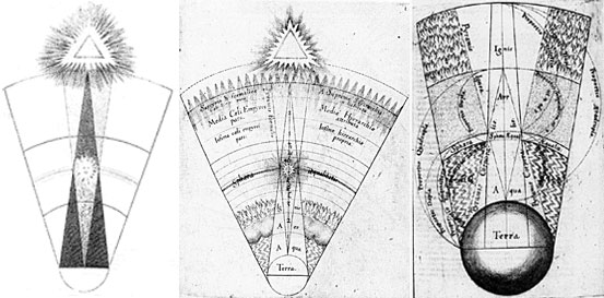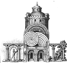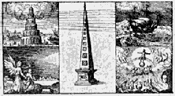 Gezeigt werden (rechts) der Turm zu Babel, Tobias mit dem Engel, ein Obelisk, ein Schiff auf hoher See und das Jüngste Gericht. Zunächst eine rein formale Feststellung: Das Arrangement der Gedächtnisbilder korrespondiert mit den fünf Eingängen des Theaters schon insofern, als sich die Proportionen entsprechen: Gehen wir dieser bevorzugten Auszeichnung der Bildmitte durch die einmal nach oben, einmal nach unten weisende Spitze von Obelisk und Erker im Kontext der Schriften Fludds nach, so stoßen wir auf eine Strukturanalogie, die uns verrät, welches Element mit dem Obelisken konnotiert ist: Fludd hat die Frage, wie die höheren und unteren Regionen des Makrokosmos zueinander in Beziehung stehen, immer wieder durch die Figur zweier sich einander durchdringender Pyramiden dargestellt: Der Obelisk, wie er auf unserem Gedächtnisbild zu sehen ist, repräsentiert also zweifelsfrei die auf der Erde gegründete Pyramide, die von der unteren Region in die höhere reicht - und nicht etwa das Licht bzw. Feuer, wie man zunächst im Rekurs auf die ägyptische Mythologie meinen könnte: Die Sonne steht bei Fludd im Schnittpunkt von zwei Pyramiden, wohingegegen der abgebildete Obelisk die Sonnenstrahlen imitiert, wie sie auf der Erde eintreffen (auch dies ist durch die Vorstellungswelt der Ägypter gestützt). Die Gleichsetzung von Obelisk und Pyramide ist, wie die Autoren der Emblemata feststellen, "allgemein in der Vorstellung der Zeit". Daß das Erdelement nach Fludd mit dem Tastsinn korreliert ist, kommt in dieser Bildwahl auch darin zum Ausdruck, daß es sich um ein kunsthandwerkliches Objekt handelt. (Das gilt zwar auch vom Turm, aber der ist nicht in vergleichbarem Sinne "greifbar".) Die Entsprechung zur unteren mittleren Tür des Gedächtnistheaters scheint mir somit formal wie funktional, im Sinne der Vermittlung von Oben und Unten, eindeutig. Und daß dieser Tür die grüne Farbe zugeordnet ist, paßt ebenfalls zu diesem Elementenbezug, widerspricht ihm zumindest nicht. Aus der Aufteilung in Oben und Unten läßt sich ein weitere Spezifikation ableiten. Denn Fludd unterschied zwischen den "oberen" Sinnesvermögen, Sehen und Hören, und den "unteren", Riechen, Schmecken und Tasten, so daß eine entsprechende Aufteilung auf die beiden Stockwerke des Theaters sich von selbst verstehen dürfte.