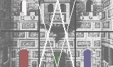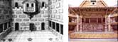 Fludds Theater zeigt an der Rückfront fünf Türen, die fünf Gedächtnisorte repräsentieren und in einer Beziehung zu fünf Säulen stehen, deren Grundrisse am vorderen Bildrand zu sehen sind. (Die Kolorierung der Türen und Säulen habe ich gemäß Fludds Beschreibung hinzugefügt, der wie auch schon frühere Memoria-Traktate Farben als zusätzliche Gedächtnisstützen empfiehlt.) Damit erhöht sich die Zahl der Gedächtnisorte um das 10-fache auf 240.