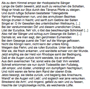 Wir werden im historischen Teil dieser Vorlesung auf Orpheus und seine reichhaltige musikalische Rezeptionsgeschichte zurückkommen. Aber schon der erste Teil der Vorlesung lässt sich aus dem Narrativ ableiten In der mythischen Überlieferung – wie in dem hier zitierten Text von Ovid – wird die Passage durchs  Schattenreich an ein Sehverbot geknüpft: Die Hüter der Unterwelt verlangen von Orpheus, "dass er die Augen zurück nicht wendete", werden wir im ersten Teil der Vorlesung ergründen, in dem es um die Spezifika der auditiven im Unterschied zur visuellen Wahrnehmung geht. Der dritte Teil wird schließlich von den Tranformationen handeln, die das Klang-Narrativ in der heutigen Medienkultur erfährt. Hierzu vorab eine vergleichende Hörprobe ...