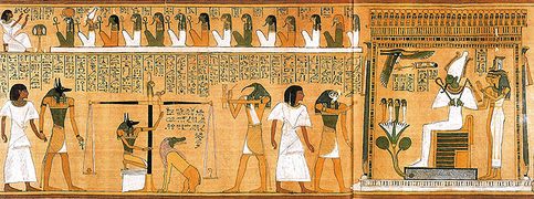 Links: Thoth notiert, ob das Herz des Verstorbenen weniger wiegt als die Feder von Maat. Quelle: Faulkner/ Andrews (1972). Eckart Sackmann (2006) bezeichnet diesen Papyrus als frühesten Vorläufer des Comics.