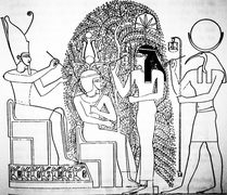 Rechts: Atum, Seschat und Thoth schreiben die Namen Ramses' II auf den heiligen Baum in Heliopolis.