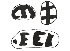 Die Kiesel von Mas d'Azil (Südfrankreich) aus der Mittelsteinzeit ähneln bisweilen verblüffend unseren Alphabetbuchstaben. Doch die äußere Form von Zeichen ist keineswegs ein zuverlässiges Schriftmerkmal. Zur Schrift werden Zeichen erst dann, wenn sie sich nach einer festgelegten Systematik wiederholen. Dies ist bei den bemalten Kieseln von Mas d'Azil nicht der Fall; es handelt sich fast ausschließlich um Unikate. Außerdem ist die Ähnlichkeit mit unseren Buchstaben, die sich erst sehr viel später in einer langen Metamorphose von der nordsemitischen über die phönizische, griechische und etruskische zur lateinischen Schrift herausbilden, natürlich reiner Zufall.