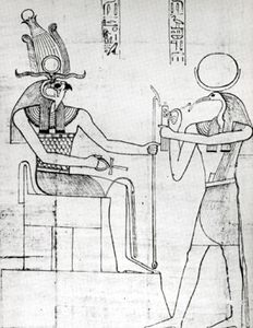 Thoth mit seinem Schreibzeug (vgl. 5.1) vor dem Sonnengott Re-Harachte, der als Götterkönig thront.