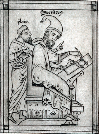 Die Abbildung aus einem Wahrsagebuch des Mittelalters ist merkwürdig: Sokrates, der bekanntlich nie geschrieben hat, sitzt hier am Schreibpult, während Platon, der ja eigentlich die Lehren seines Meisters aufschrieb, diktierend hinter ihm steht. Hat der Illustratur die Namen vertauscht?