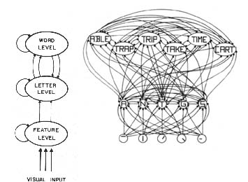 Sogenannte "Bottom-up-Modelle" der Worterkennung, wie z.B. das abgebildete von McClelland/Rumelhart (1981), das auch in der neuesten Forschungsliteratur aufgegriffen wird (vgl. Dehaene 2007, S. 59), sind unzutreffend, sofern sie den Eindruck erwecken, dass unser Gehirn sukzessive aus Strichelementen buchstaben und aus diesen wiederum Wörter bilde. Wie sich anhand der zuvor erörterten Experimentalbefunde klar zeigen lässt, funktioniert die Worterkennung (wie übrigens Wahrnehmungsprozesse überhaupt) vorwiegend im "Top-down-Modus", das heißt: In unserem Gehirn operieren Erwartungssysteme ("Heuristiken"), die schon auf partiell erfasste Schriftmerkmale mit kompletten Wort- und Wortgruppen-Annahmen reagieren. Dabei konkurrieren freilich oft mehrere alternative Worterkennungs-"Vorschläge". Welcher sich durchsetzt, hängt in der Regel nicht davon ab, ob sämtliche Features und Buchstaben korrekt identifiziert wurden, sondern ob er dem jeweiligen Leser plausibel erscheint.