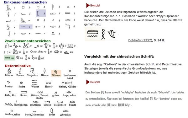 古埃及的文字系统中不仅有单音标符号,还有双、三音标符号,这大大增加了阅读古埃及文本和认识这些音标符号的难度。加上元音的缺失,导致出现许多同形异义词。为了消除歧义,埃及人又补充了一些符号,即所谓的限定词。这些限定词指明了某多义词在特定语境下的具体含义是什么。
