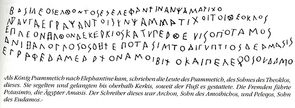 - Griechische Inschrift in ionischem Alphabet an einer Statue des Tempels von Abu Simbel (6. Jh. v. Chr.), rechtsläufig.