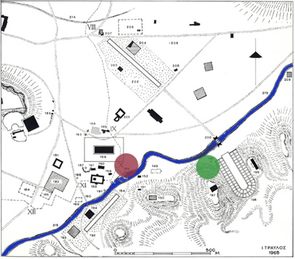 Die Karte zeigt den Weg, den Sokrates und Phaidros gehen, und die Stelle, wo sie sich niederlassen: Lysias, der eigentlich im Piräus wohnt, ist in Athen bei Epikrates untergebracht, in der Nähe des Olympieion (Rechteck links oben des roten Punkts). Von dort kommt Phaidros, als er Sokrates trifft. Die beiden gehen durch eines von drei nahegelegenen Stadttoren zum Ilissos (blau) und lassen sich schließlich an einer Platane nieder (grüner Punkt, das Stadion des Lykurg, rechts davon, war damals noch nicht gebaut), wo ein später gefundenes Relief auf das im Gespräch erwähnte Pan-Heiligtum hinweist (s. Abb. rechts, im oberen Teil Pan und drei Nymphen). Das Heiligtum von Agra und der Altar des Boreas, die ebenfalls erwähnt werden, befindet sich, wie es ausdrücklich heißt, "zwei oder drei Stadien weiter unterhalb" (innerhalb des roten Punkts bzw. gegenüber auf dem anderen Ufer).