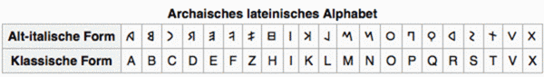 Zu den frühesten erhaltenen Zeugnissen lateinischer Schrift gehören der Lapis Niger (um 600 v. Chr., Abb. 1a) und die Duenos-Inschrift (erste Hälfte des 6. Jahrhunderts v. Chr.). Diese archaischen lateinischen Alphabete bestanden aus 21 Buchstaben (s. Abb. 1b). Die Schriftzeichen entsprechen hier noch (mit Ausnahme des Buchstabens B) den altsemitischen Urformen.