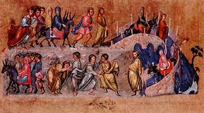 基督教的书籍最初也采用了这种栩栩如生的图画特点:六世纪的Codex purpureus Rossanensis(左下)正是以奢侈的细节描绘和鲜明的色彩闻名。