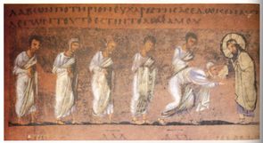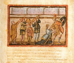 Auch die Bücher christlichen Inhalts übernehmen zunächst diesen lebensnahen Bildcharakter: So zeichnet sich der Codex purpureus Rossanensis aus dem 6. Jh. (unten links) ebenfalls noch durch aufwendige Detailzeichnung und Farbgebung aus.