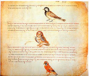 In der römischen Spätantike überwiegen zunächst noch realistische Bilder, die das irdische Leben in detailreicher Ausschmückung darstellen: Der um 400 entstandene Vergilius Vaticanus (Abb. oben links), eine illustrierte Sammlung der Texte Vergils, zeigt lebensnahe Figuren mit individuellen Zügen und verstärkt die Bildwirkung durch Umrahmung der Szenen. Und die Ornithiaka des Dionysios (oben rechts), ein Lehrgedicht über die Vögel, das vor 512 im sog. Wiener Dioscurides erschien, lässt große Liebe zum Detail und naturalistische Ambitionen erkennen.