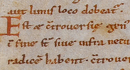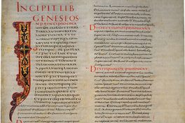 摘自Alkuin-Bibel (825/830)的图例包括带装饰的作为首字母的大写罗马字母, Capitalis quadrata/rustica作为补题, 安尔色字体作为引入行,卡洛林小写字母作为文章主体。