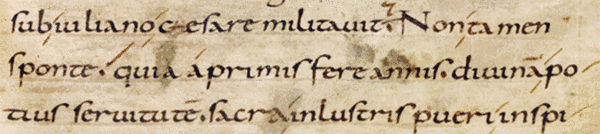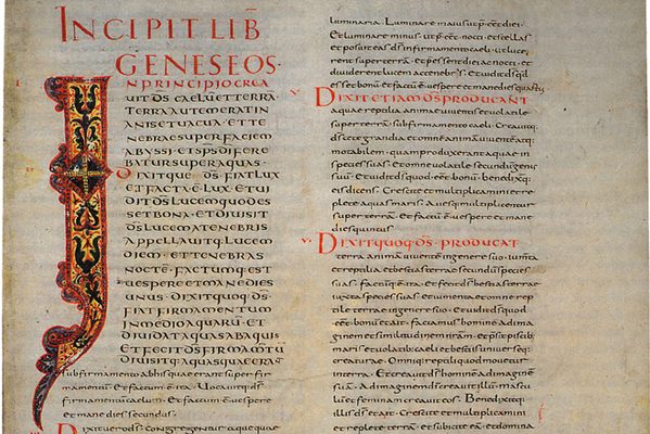 Das Abbildungsbeispiel aus der Alkuin-Bibel (825/830) enthält eine verzierte römische Majuskel als Initiale, die Capitalis quadrata/rustica für den Seitentitel, Unzialschrift für die Eingangszeilen und die karolingische Minuskel für den Haupttext.