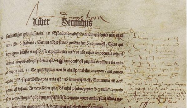 Ein früher Druck der Hauptschriften des Aristoteles (Leipzig 1506) aus der Bibliothek von Werner Oechslin. Der Text – hier De anima – ist Seite für Seite nicht nur am Rand ("Randglossen"), sondern auch zwischen den Zeilen ("Interlinearglossen") mit handschriftlichen Kommentaren von Lesern unterschiedlicher Zeiten und Kulturkreise versehen.