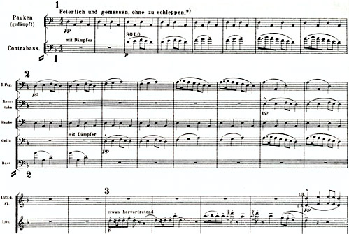 Unser Beispiel aus Gustav Mahlers 1. Symphonie ist die Parodie eines Trauermarsches. Mahler, der eine heitere, von menschlichen Eingriffen ungestörte Naturstimmung komponieren wollte, verwendete dafür den bekannten Kinderkanon Meister Jakob (frz. Frère Jacques), transponierte ihn von Dur in Moll und intonierte ihn im für Trauermärsche typischen, schleppenden Rhythmus. Ausdrücklich hatte Mahler bei der Uraufführung verlangt, daß der Kontrabass falsch spielt, um die kindliche Albernheit zu unterstreichen. In die Trauermarsch-Stimmung fällt schließlich eine unpassend fröhlich akzentuierte Oboe ein.