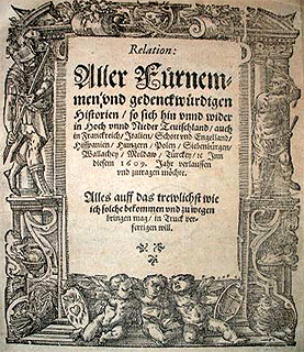 Doch erst die periodische Verbreitung von Neuigkeiten etablierte die Zeitung im engeren Wortsinn. Die Abb. zeigt die älteste Zeitung der Welt, die sog. Straßburger Relation (gegründet 1605, im Bild der älteste erhaltene Jahrgang 1609), die alle "gedenckwürdigen Historien" des aktuellen Jahres "auf das trefflichste ... in Truck verfertigen will" und damit erstmals eine publizistische Verbreitung von Neuigkeiten in regelmäßigen Intervallen ankündigt. Die Auflage dürfte bei einigen hundert Exemplaren gelegen haben.