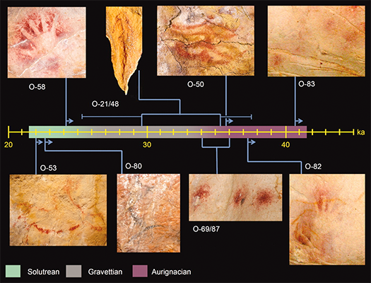 通过测量铀同位素的衰变给年代久远的洞穴壁画标注日期。黄色的标度尺展示了20000年到45000年的最低年龄。