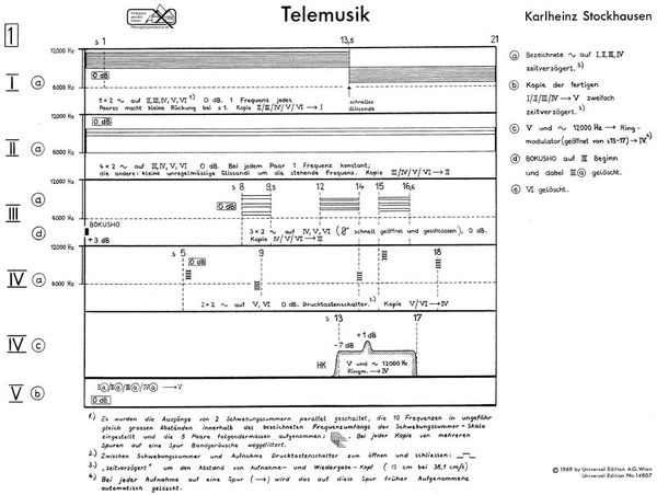 Ausschnitt aus der „Partitur“ der Telemusik: entnommen aus Stockhausen, Karlheinz (1969): Telemusik, Nr. 20. Partitur. Wien: Universal Edition, S. 1. Quelle: http://museum.rechtaufremix.org/tour/musik/guide/3/ (15.5.2014).