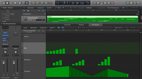 beispielhafte Darstellung einer "Partitur" mit der Musikproduktionssoftware Logic X (eigene Darstellung)