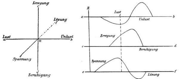 Eine heute noch prominente Grundlage hierfür ist das dreidimensionale Modell der Grundgefühle nach Wilhelm Wundt (1873). Ihm zufolge lässt sich jedes Grundgefühl als ein Raumpunkt auf den drei Koordinaten Lust–Unlust, Erregung–Beruhigung und Spannung–Lösung verorten (Abb. links).
