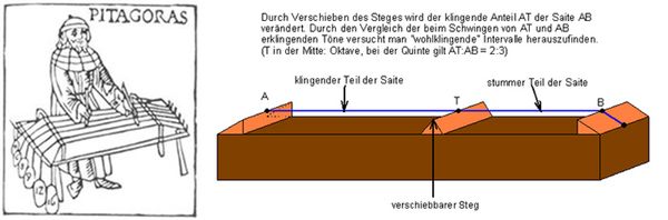 Pythagoras machte die Entdeckung, dass die Tonhöhe einer schwingenden Saite bei Halbierung ihrer Länge konsonant ist (also eine Oktave bildet) und sich immer dann harmonische Intervalle ergeben, wenn die weiteren Unterteilungen der Saite ganzzahligen Brüchen entspricht.
