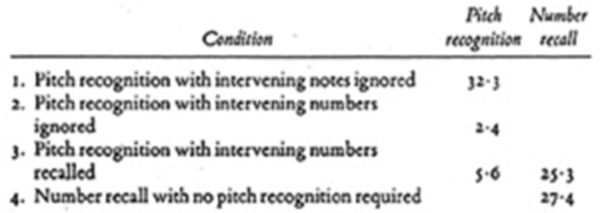 Es zeigte sich, dass Gruppe A weit größere Schwierigkeiten mit der Aufgabe hatte als die zweite (s. Tabelle unten). Daraus lässt sich folgern, dass der "phonological loop" des Merkens von Ziffern unabhängig von dem arbeitete, was Berz später "music memory loop" nannte.