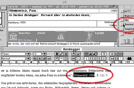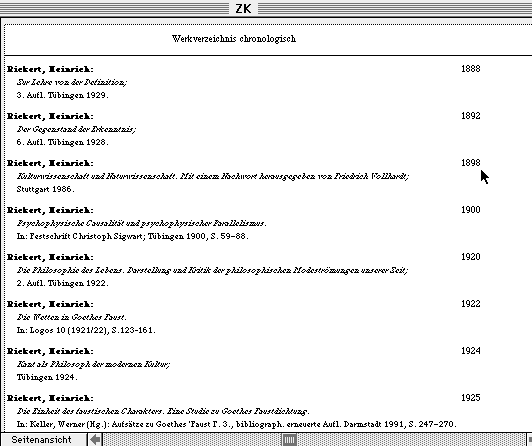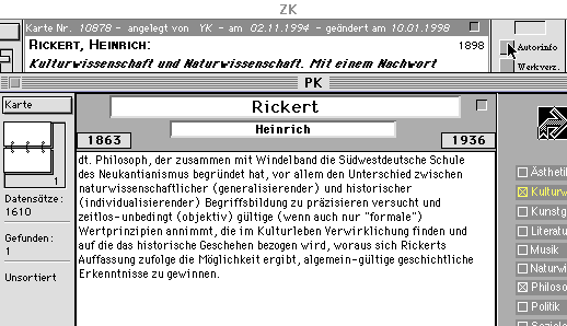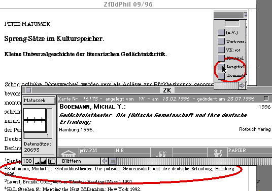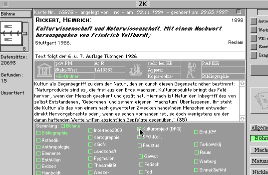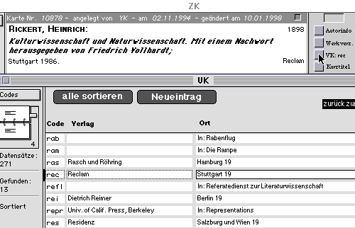 Die Datenbank, die beständig weiterentwickelt wird, ist auch online verfügbar: Zugang Eine Einführung in die Funktionen bietet unser interaktives Tutorial ZK-Führerschein. Das - dem ehemaligen genius loci Tribut zollende - Kürzel ZK steht für "Zentralkartei", eine FileMaker-Datenbank, die eine Fülle bibliographischer Funktionen enthält. So lassen sich z.B. Literaturlisten in verschiedenen Verlags-Formaten ausgeben oder Bibliographien als Web-Seiten exportieren. Selbstverständlich ist auch die Arbeit in LAN- und WAN-Netzwerken möglich. Mit der ZK verknüpft sind: Das Kürzel steht für "Personenkartei" und stellt Informationen über die in der ZK enthaltenen Autoren bereit (z.T. mit ausführlichen Biographien, insbesondere zur Wissenschaftsgeschichte). Das bedeutet "Verlagskartei" und dient insbesondere der Erleichterung der Eingabe von Büchern und Zeitschriften. Ansichten: