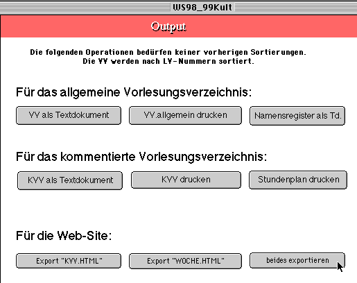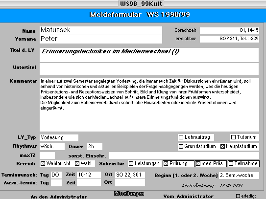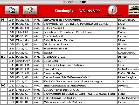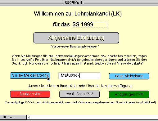 LK steht für Lehrplan-Kartei. Sie basiert auf einer relationalen FileMaker-Applikation, die von der Erfassung der Meldungen von Lehrveranstaltungen und Kommentartexten über die Raumverteilung und Stundenplanerstellung bis zum Export einer mit Kommentartexten verknüpften Wochenübersicht als HTML-Datei alle Schritte der Lehrplanerstellung und-Publikation unterstützt.