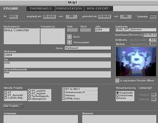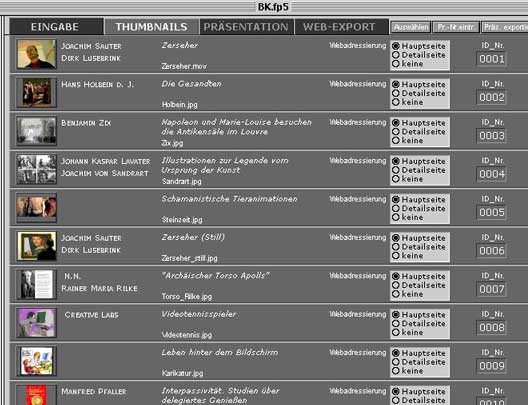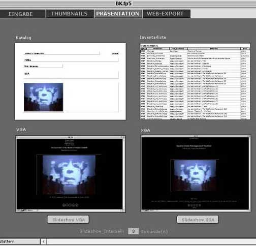 BK steht für Bild-Kartei. Freilich finden auch Sound- und Filmdaten unterschiedlichster Formate darin Eingang. Neben den ueblichen Verwaltungs- und Darstellungsfunktionen bietet die BK Möglichkeiten zur Erstellung kompletter Präsentationen auf HTML-Basis.
