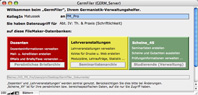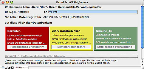 • Lehrveranstaltungen (gelb): Verwaltet alle Lehrveranstaltungen der Germanistik inkl. Modulzuordnungen, Zulassungsbeschränkungen, Kommentartexten etc. und erstellt daraus Print- und Online-KoVos, Aushänge und Stundenpläne. Lehraufträge werden in den erforderlichen Formularen automatisch ausgefüllt und können hinsichtlich Kosten und Kapazitätsauslastung berechnet werden. Slideshow: • Scheine (grün): kombiniert die von der Verwaltung bereitgestellten Studierendeninformationen mit den Daten der belegten Lehrverantzaltungen und erzeugt daraus Teilnehmerlisten, Anwesenheitslisten, E-Mail-Listen, vorausgefüllte Scheinformulare und Studienbücher. Außerdem können Prüfungsinformationen (Leistungsübersichten, Themen, Termine, Gutachter) verwaltet und Gutachten mit vorausgefülltem Briefkopf und Betreff geschrieben werden. Beim Ausdruck von Scheinen und Gutachten können die Studierenden automatisch per Mail benachrichtigt werden. Slideshow: