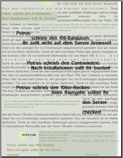 Das damals zur Betreuung der Seiten gebildete Web-Team ist eine dauerhafte Einrichtung geworden, deren Leitung mittlerweile an die nächste AssistentInnengeneration überging. Daß manche Probleme bei aller Innovation dieselben bleiben, ruft mir diese Collage von Larissa aus meinen frühen Mahnschreiben in Erinnerung: