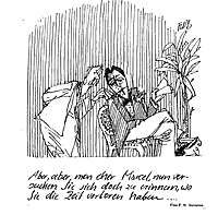 There is a caricature of Marcel Proust in which the despairing writer is consoled by a friend saying, "Aber, aber, mon cher Marcel, nun versuchen Sie sich doch zu erinnern, wo Sie die Zeit verloren haben "[1]