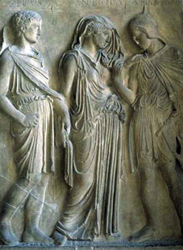 Hermes, Eurydike, Orpheus. Grabplattenrelief (5. Jh. v. Chr.)
