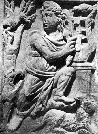 Orpheus-Christus-Mithras als guter Hirte aus Porto Torres, Sardinien (ca. 300). Rom, Campo Verano.