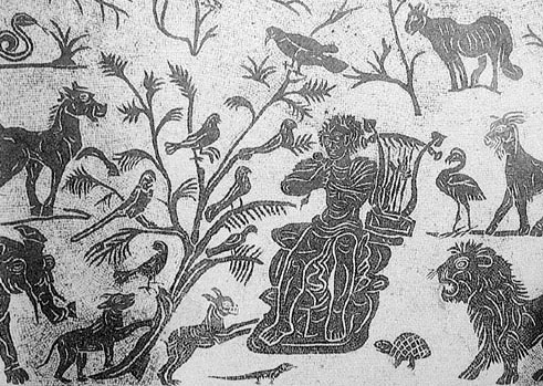 Unten: Orpheus unter den Tieren (2. Jh.). Nationalmuseum Rom.